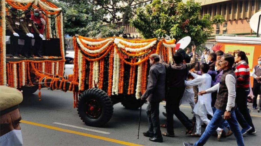 ਸੀਡੀਐਸ ਬਿਪਿਨ ਰਾਵਤ ਅਤੇ ਉਨ੍ਹਾਂ ਦੀ ਪਤਨੀ ਮਧੁਲਿਕਾ ਰਾਵਤ ਦੀ ਮ੍ਰਿਤਕ ਦੇਹ ਨੂੰ ਅੰਤਿਮ ਦਰਸ਼ਨਾਂ ਲਈ ਉਨ੍ਹਾਂ ਦੀ ਸਰਕਾਰੀ ਰਿਹਾਇਸ਼ ‘ਤੇ ਰੱਖਿਆ ਗਿਆ ਹੈ। ਸੀਡੀਐਸ ਬਿਪਿਨ ਰਾਵਤ ਨੂੰ ਸ਼ਰਧਾਂਜਲੀ ਦੇਣ ਲਈ ਕਾਂਗਰਸ ਨੇਤਾ ਰਾਹੁਲ ਗਾਂਧੀ ਸਮੇਤ ਕਈ ਪਤਵੰਤੇ ਉਨ੍ਹਾਂ ਦੀ ਰਿਹਾਇਸ਼ ‘ਤੇ ਪਹੁੰਚੇ। ਇਸ ਹਾਦਸੇ ਵਿੱਚ ਆਪਣੀ ਜਾਨ ਗਵਾਉਣ ਵਾਲੇ ਬ੍ਰਿਗੇਡੀਅਰ ਲਿਡਰ ਦਾ ਦਿੱਲੀ ਕੈਂਟ ਦੇ ਬਰਾੜ ਸਕੁਏਅਰ ਵਿਖੇ ਸਸਕਾਰ ਕਰ ਦਿੱਤਾ ਗਿਆ। ਅੰਤਿਮ ਸੰਸਕਾਰ ਮੌਕੇ ਰੱਖਿਆ ਮੰਤਰੀ ਰਾਜਨਾਥ ਸਿੰਘ ਬਰਾੜ ਸਕੁਏਅਰ, ਦਿੱਲੀ ਕੈਂਟ ਵਿਖੇ ਮੌਜੂਦ ਸਨ।