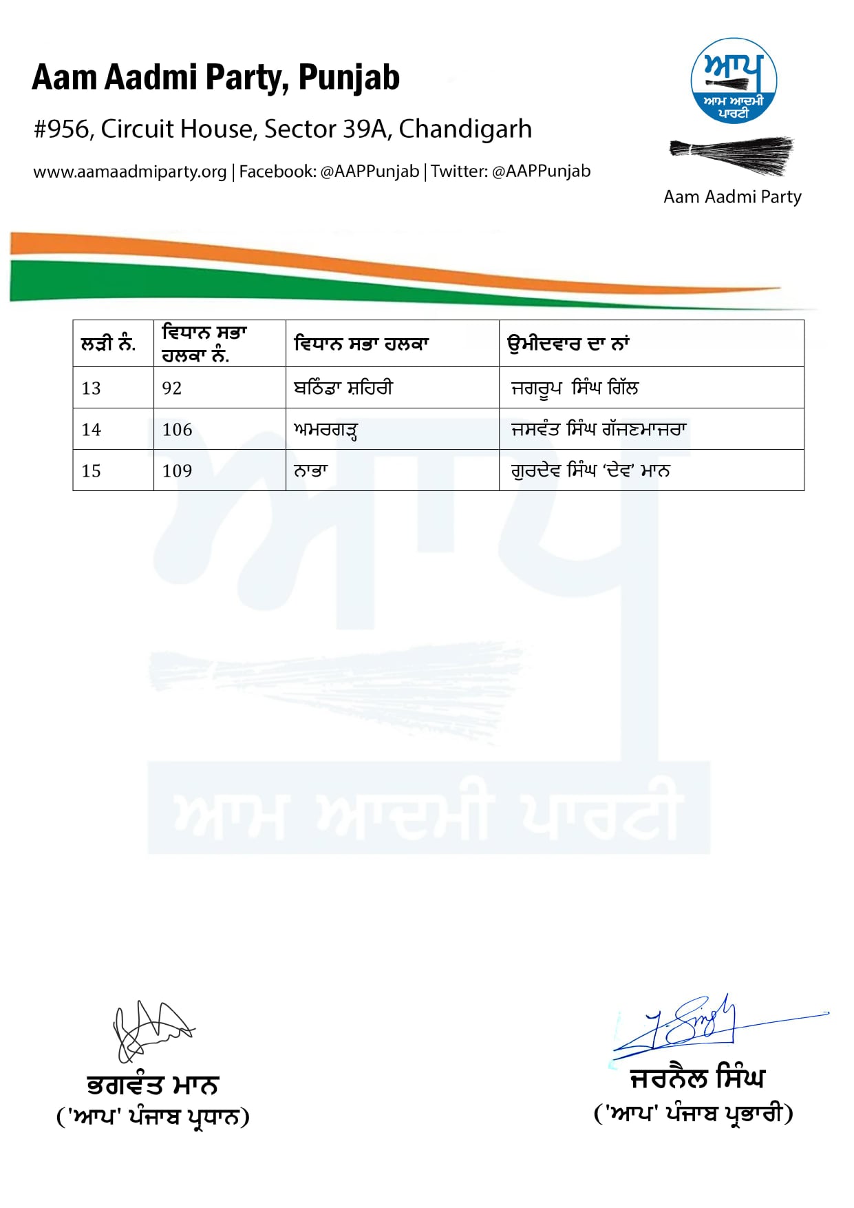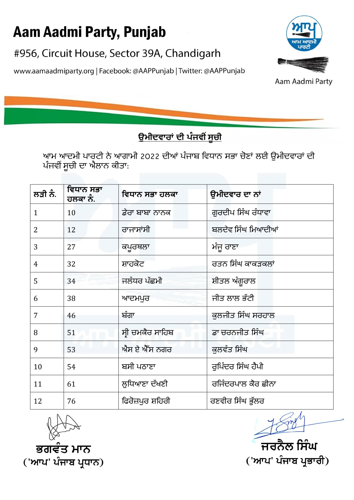 ਆਮ ਆਦਮੀ ਪਾਰਟੀ ਨੇ ਆਗਾਮੀ 2022 ਦੀਆਂ ਪੰਜਾਬ ਵਿਧਾਨ ਸਭਾ ਚੋਣਾਂ ਲਈ ਉਮੀਦਵਾਰਾਂ ਦੀ ਪੰਜਵੀਂ ਸੂਚੀ ਦਾ ਐਲਾਨ ਕੀਤਾ।