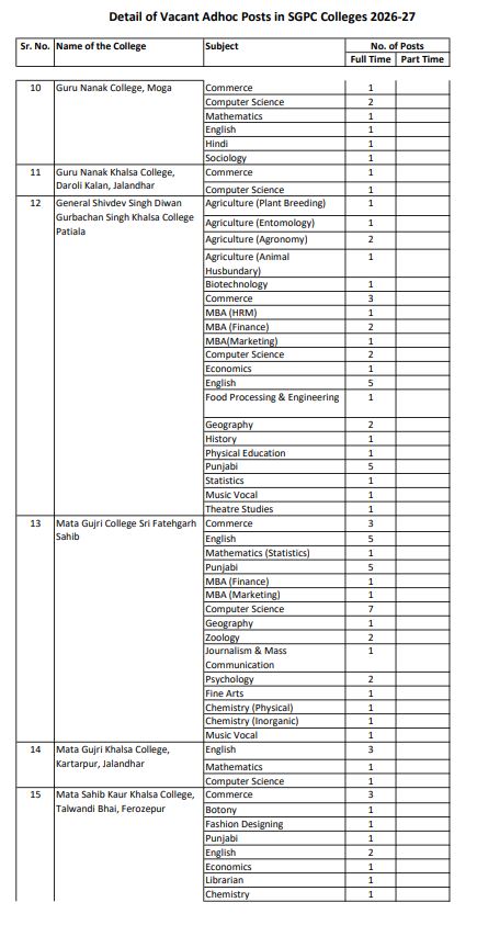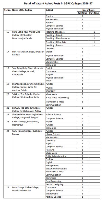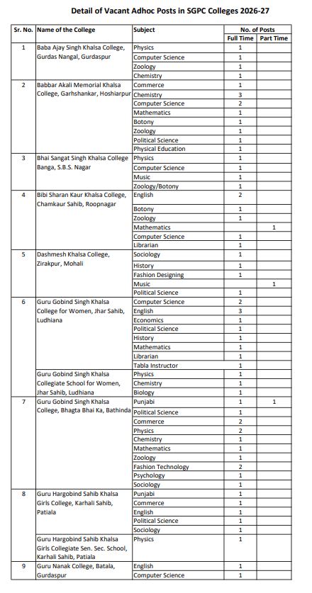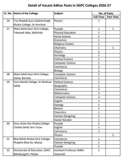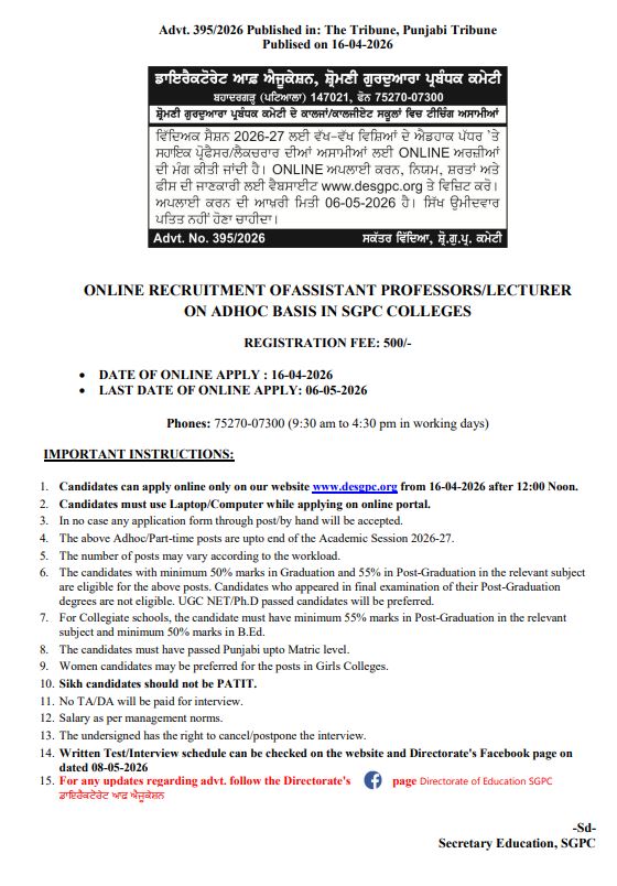 ਪੰਜਾਬ ਵਿੱਚ ਪ੍ਰੋਫੈਸਰਾਂ ਦੀਆਂ ਅਸਾਮੀਆਂ ਨਿਲਕਣ ਦੀ ਉਡੀਕ ਕਰ ਰਹੇ ਨੌਜਵਾਨਾਂ ਲਈ ਇਹ ਚੰਗੀ ਖਬਰ ਹੈ। ਇਰੈਕਟੋਰੇਟ ਆਫ਼ ਐਜੂਕੇਸ਼ਨ, ਸ਼੍ਰੋਮਣੀ ਗੁਰਦੁਆਰਾ ਪ੍ਰਬੰਧਕ ਕਮੇਟੀ ਵੱਲੋਂ 268  ਪ੍ਰੋਫੈਸਰ/ਲੈਕਚਰਾਰ ਦੀਆਂ ਅਸਾਮੀਆਂ ਲਈ ਆਨਲਾਈਨ ਅਰਜ਼ੀਆਂ ਦੀ ਮੰਗ ਕੀਤੀ ਗਈ ਹੈ। ਯੋਗ ਉਮੀਦਵਾਰ 6 ਮਈ 2026 ਤੱਕ ਆਨਲਾਈਨ ਅਪਲਾਈ ਕਰ ਸਕਦੇ ਹਨ।