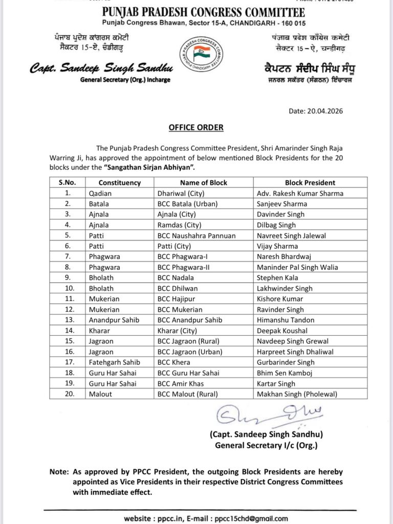 ਪੰਜਾਬ ਕਾਂਗਰਸ ਵੱਲੋਂ ਬਲਾਕ ਪ੍ਰਧਾਨਾਂ ਦਾ ਐਲਾਨ