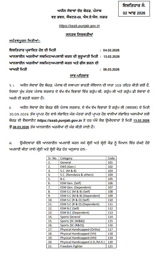 ਪੰਜਾਬ ਵਿਚ ਸਰਕਾਰੀ ਨੌਕਰੀਆਂ ਨਿਕਲਣ ਦੀ ਉਡੀਕ ਕਰ ਰਹੇ ਨੌਜਵਾਨਾਂ ਲਈ ਇਹ ਅਹਿਮ ਖਬਰ ਹੈ। ਪੰਜਾਬ ਸਰਕਾਰ ਵੱਲੋਂ ਵੱਖ ਵੱਖ ਵਿਭਾਗਾਂ ਵਿਚ ਕਲਰਕਾਂ ਦੀਆਂ ਅਸਾਮੀਆਂ ਕੱਢੀਆਂ ਗਈਆਂ ਹਨ। ਅਧੀਨ ਸੇਵਾਵਾਂ ਚੋਣ ਬੋਰਡ ਪੰਜਾਬ ਰਾਹੀਂ ਪੰਜਾਬ ਸਰਕਾਰ ਵੱਲੋਂ ਗਰੁੱਪ ਸੀ ਦੀਆਂ ਅਸਾਮੀਆਂ ਲਈ ਅਰਜ਼ੀਆਂ ਦੀ ਮੰਗ ਕੀਤੀ ਗਈ ਹੈ। SSSB ਵੱਲੋਂ ਵੱਖ ਵੱਖ ਵਿਭਾਗਾਂ ਵਿਚ ਕਲਰਕਾਂ ਦੀਆਂ ਅਸਾਮੀਆਂ ਵਾਸਤੇ ਆਨਲਾਈਨ ਅਰਜ਼ੀਆਂ ਦੀ ਮੰਗ ਕੀਤੀ ਗਈ ਹੈ। ਯੋਗ ਉਮੀਦਵਾਰ 06 ਮਾਰਚ 2026 ਤੱਕ ਆਨਲਾਈਨ ਅਪਲਾਈ ਕਰ ਸਕਦੇ ਹਨ।