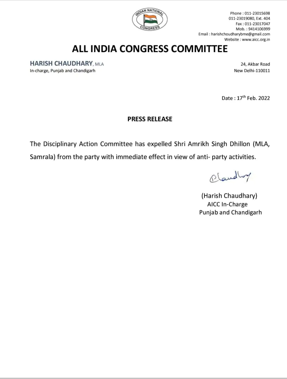 ਕਾਂਗਰਸ ਨੇ ਸਮਰਾਲਾ ਤੋਂ ਐਮਐਲਏ ਅਮਰੀਕ ਸਿੰਘ ਢਿੱਲੋਂ ਨੂੰ ਪਾਰਟੀ ‘ਚੋਂ ਬਾਹਰ ਕੱਢਿਆ.