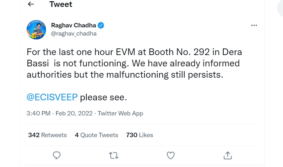 ਡੇਰਾਬੱਸੀ ਵਿੱਚ ਪਿਛਲੇ ਇੱਕ ਘੰਟੇ ਤੋਂ EVM ਕੰਮ ਨਹੀਂ ਕਰ ਰਹੀ : ਰਾਘਵ ਚੱਢਾ