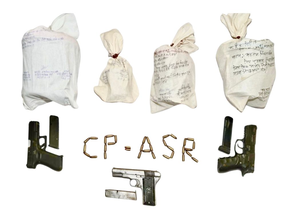 ਇੱਕ ਵੱਡੀ ਸਫਲਤਾ ਹਾਸਲ ਕਰਦੇ ਹੋਏ, ਅੰਮ੍ਰਿਤਸਰ ਕਮਿਸ਼ਨਰੇਟ ਪੁਲਿਸ ਵੱਲੋਂ ਸਰਹੱਦ ਪਾਰੋਂ ਨਸ਼ੀਲੇ ਪਦਾਰਥਾਂ ਅਤੇ ਗੈਰ-ਕਾਨੂੰਨੀ ਹਥਿਆਰਾਂ ਦੀ ਤਸਕਰੀ ਕਰਨ ਵਾਲੇ ਦੋ ਸੰਗਠਿਤ ਮਾਡਿਊਲਾਂ ਦਾ ਪਰਦਾਫਾਸ਼ ਕੀਤਾ ਗਿਆ ਅਤੇ ਕੁੱਲ 10 ਮੁਲਜ਼ਮਾਂ ਨੂੰ ਗ੍ਰਿਫ਼ਤਾਰ ਕਰਕੇ 5.438 ਕਿਲੋਗ੍ਰਾਮ ਹੈਰੋਇਨ, 3 ਆਧੁਨਿਕ ਪਿਸਤੌਲ (ਇੱਕ ਗਲੌਕ 9mm, ਇੱਕ ਜ਼ਿਗਾਨਾ 9mm, ਇੱਕ .32 ਬੋਰ), 34 ਜ਼ਿੰਦਾ ਕਾਰਤੂਸ, ਅਤੇ 4500 ਰੁਪਏ ਡਰੱਗ ਮਨੀ ਬਰਾਮਦ ਕੀਤੀ ਗਈ।