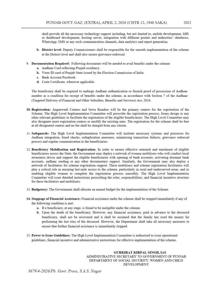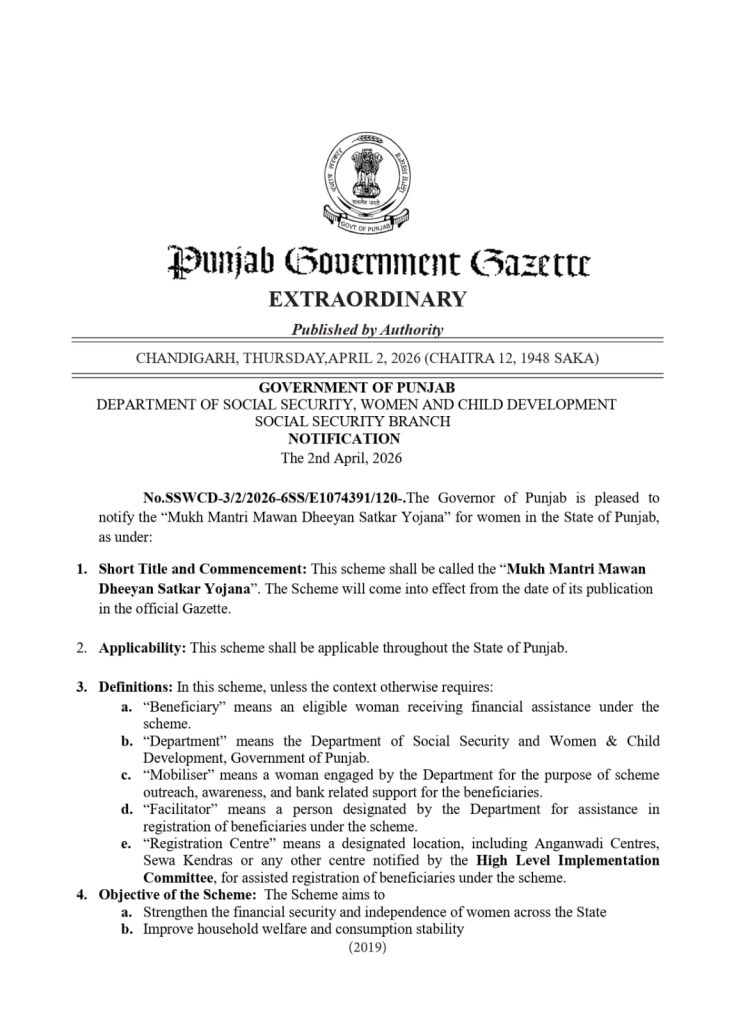 ਮੁੱਖ ਮੰਤਰੀ ਮਾਵਾਂ ਧੀਆਂ ਸਤਿਕਾਰ ਯੋਜਨਾ ਦਾ ਨੋਟੀਫਿਕੇਸ਼ਨ ਜਾਰੀ