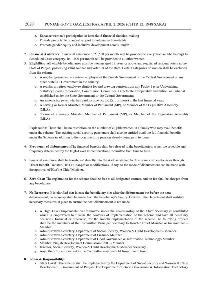 ਪੰਜਾਬ ਦੀਆਂ ਔਰਤਾਂ ਨੂੰ ਇਸ ਯੋਜਨਾ ਦਾ ਲਾਭ ਮਿਲੇਗਾ। ਜਨਰਲ ਸ਼੍ਰੇਣੀ ਦੀਆਂ ਔਰਤਾਂ ਨੂੰ ਪ੍ਰਤੀ ਮਹੀਨਾ ₹1,000 ਦੀ ਵਿੱਤੀ ਸਹਾਇਤਾ ਮਿਲੇਗੀ, ਜਦੋਂ ਕਿ ਅਨੁਸੂਚਿਤ ਜਾਤੀ SC  ਸ਼੍ਰੇਣੀ ਦੀਆਂ ਔਰਤਾਂ ਨੂੰ ਪ੍ਰਤੀ ਮਹੀਨਾ ₹1,500 ਪ੍ਰਾਪਤ ਹੋਣਗੇ।