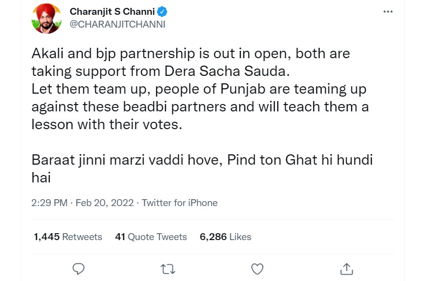 ਮੋਹਾਲੀ: ਪੰਜਾਬ ਦੇ ਮੁੱਖ ਮੰਤਰੀ ਚਰਨਜੀਤ ਸਿੰਘ ਚੰਨੀ ਨੇ ਟਵੀਟ ਰਾਹੀਂ ਭਾਜਪਾ ਤੇ ਅਕਾਲੀ ਦਲ ‘ਤੇ ਨਿਸ਼ਾਨਾ ਸਾਧਦੇ ਹੋਏ ਕਿਹਾ, “ਅਕਾਲੀ ਦਲ ਅਤੇ ਭਾਜਪਾ ਦੀ ਭਾਈਵਾਲੀ ਖੁੱਲ੍ਹ ਕੇ ਸਾਹਮਣੇ ਆ ਰਹੀ ਹੈ। ਦੋਵੇਂ ਡੇਰਾ ਸੱਚਾ ਸੌਦਾ ਦਾ ਸਮਰਥਨ ਲੈ ਰਹੇ ਹਨ। ਆਓ ਇਕੱਠੇ ਹੋਵੋ, ਪੰਜਾਬ ਦੇ ਲੋਕ ਇੱਕਜੁੱਟ ਹੋ ਰਹੇ ਹਨ।” ਇਹਨਾਂ ‘ਬੇਇੱਜ਼ਤ’ ਕਾਮਰੇਡਾਂ ਦੇ ਖਿਲਾਫ ਅਤੇ ਇਹਨਾਂ ਨੂੰ ਵੋਟਾਂ ਨਾਲ ਸਬਕ ਸਿਖਾਵਾਂਗੇ। ਬਰਾਤ ਜਿੰਨੀ ਮਰਜੀ ਵੱਡੀ ਹੋਵੇ, ਪਿੰਡ ਤੋਂ ਘੱਟ ਹੀ ਹੁੰਦੀ ਹੈ।