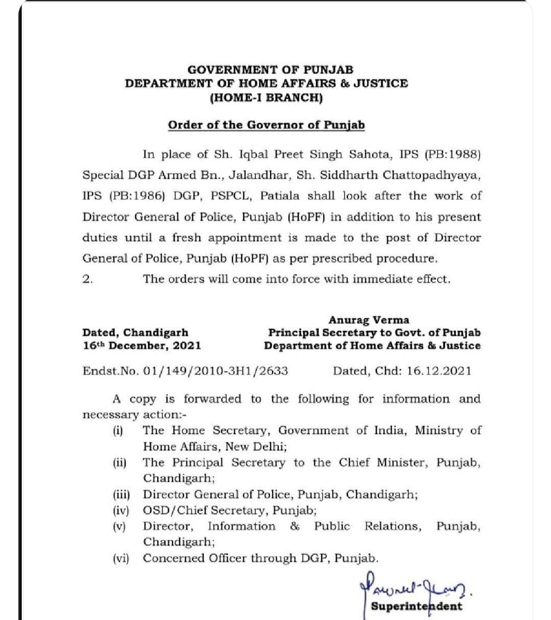 ਹੁਣ ਇਕਬਾਲ ਪ੍ਰੀਤ ਸਿੰਘ ਸਹੋਤਾ ਦੀ ਥਾਂ ‘ਤੇ ਸਿਧਾਰਥ ਚਟੋਪਾਧਿਆਏ (Siddharth Chattopadhyay )ਨੂੰ ਡਾਇਰੈਕਟਰ ਜਨਰਲ ਆਫ਼ ਪੁਲਿਸ, ਪੰਜਾਬ ਨਿਯੁਕਤ ਕੀਤਾ ਗਿਆ ਹੈ। ਨਵਜੋਤ ਸਿੰਘ ਸਿੱਧੂ ਸ਼ੁਰੂ ਤੋਂ ਹੀ ਇਕਬਾਲ ਪ੍ਰੀਤ ਸਿੰਘ ਸਹੋਤਾ ਦੀ ਡੀਜੀਪੀ ਨਿਯੁਕਤੀ ਦਾ ਵਿਰੋਧ ਕਰ ਰਹੇ ਸਨ।