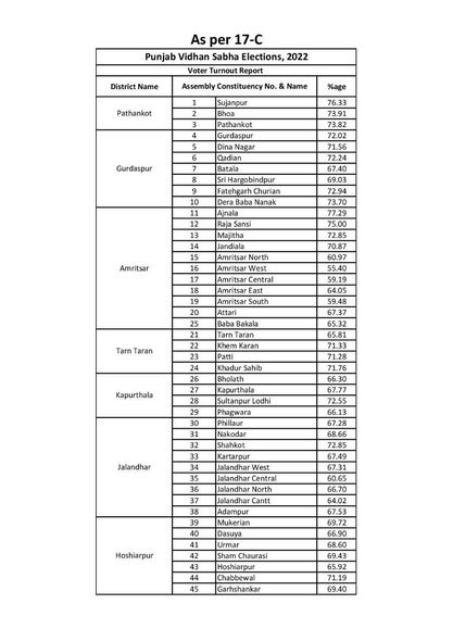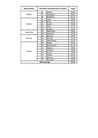 ਪੰਜਾਬ ਵਿੱਚ 117 ਵਿਧਾਨ ਸਭਾ ਸੀਟਾਂ ਲਈ 71.95% ਮਤਦਾਨ ਹੋਇਆ। ਪਿਛਲੀ ਵਾਰ ਪੰਜਾਬ ਵਿੱਚ 77% ਮਤਦਾਨ ਦਰਜ ਕੀਤਾ ਗਿਆ ਸੀ। ਉਸ ਲਿਹਾਜ਼ ਨਾਲ ਇਸ ਵਾਰ ਵੋਟਿੰਗ ਵਿੱਚ 5% ਦੀ ਕਮੀ ਆਈ ਹੈ।